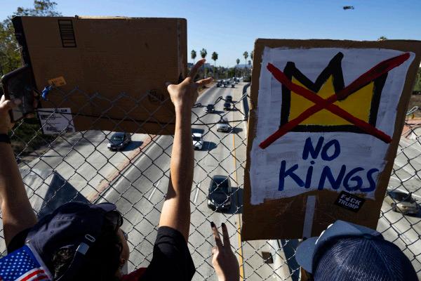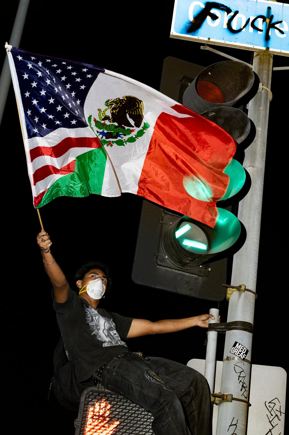A protester climbs a stoplight on Commercial Street waving anmerican flag in front of the Metropolitan Detention Center, after the conclusion of the No Kings protest in downtown Los Angeles on Saturday, Oct. 18, 2025. Jake Crandall | The Corsair