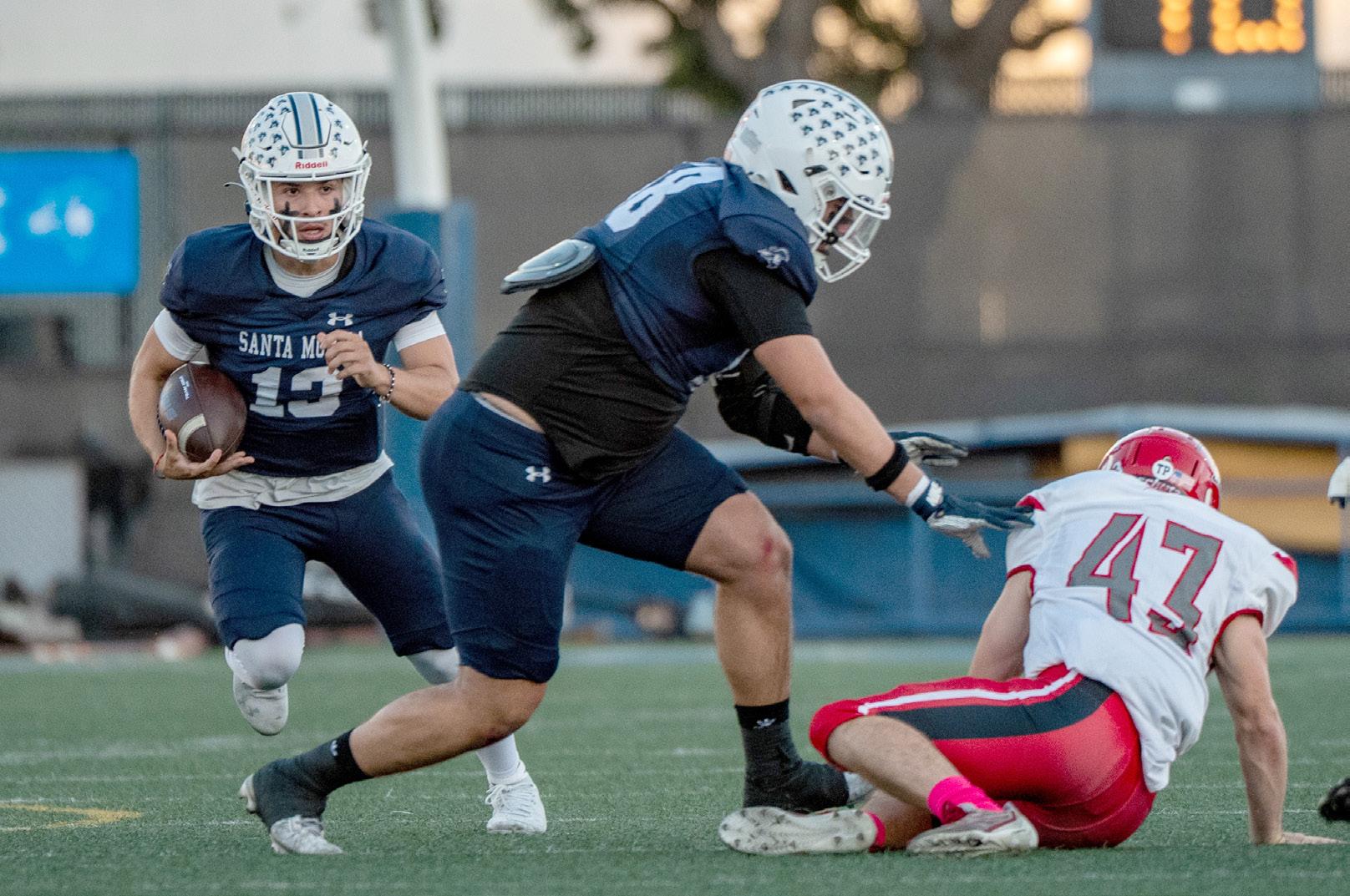 Santa Monica College (SMC) Corsair QB (13) Dylan Moreno running the ball on Thursday, October 9, 2025, Santa Monica,Calif. The Corsairs won 61-0.