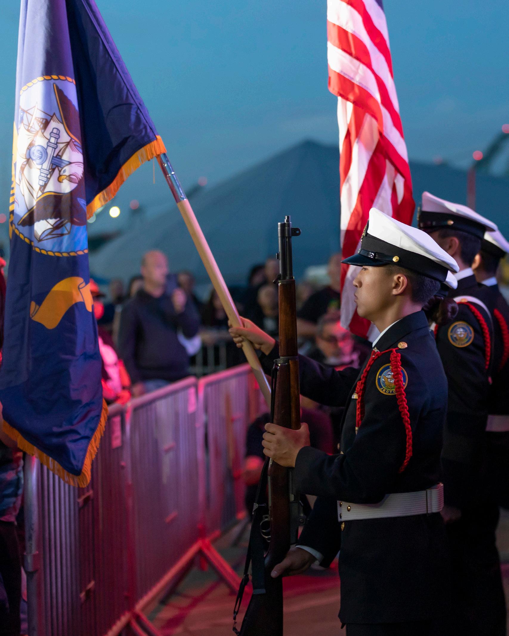 Troy High School Color Guard of Fullerton, Calif presents the National Anthem at the “Rock for Responders” concert at the USS Iowa in San Pedro, Calif., on Thursday, Feb. 27, 2025. “Rock for Responders” was held to raise funds through the Pacific Battleship Center to support disaster efforts across Los Angeles and to honor first responders. (Lisa Whitmore | The Corsair)