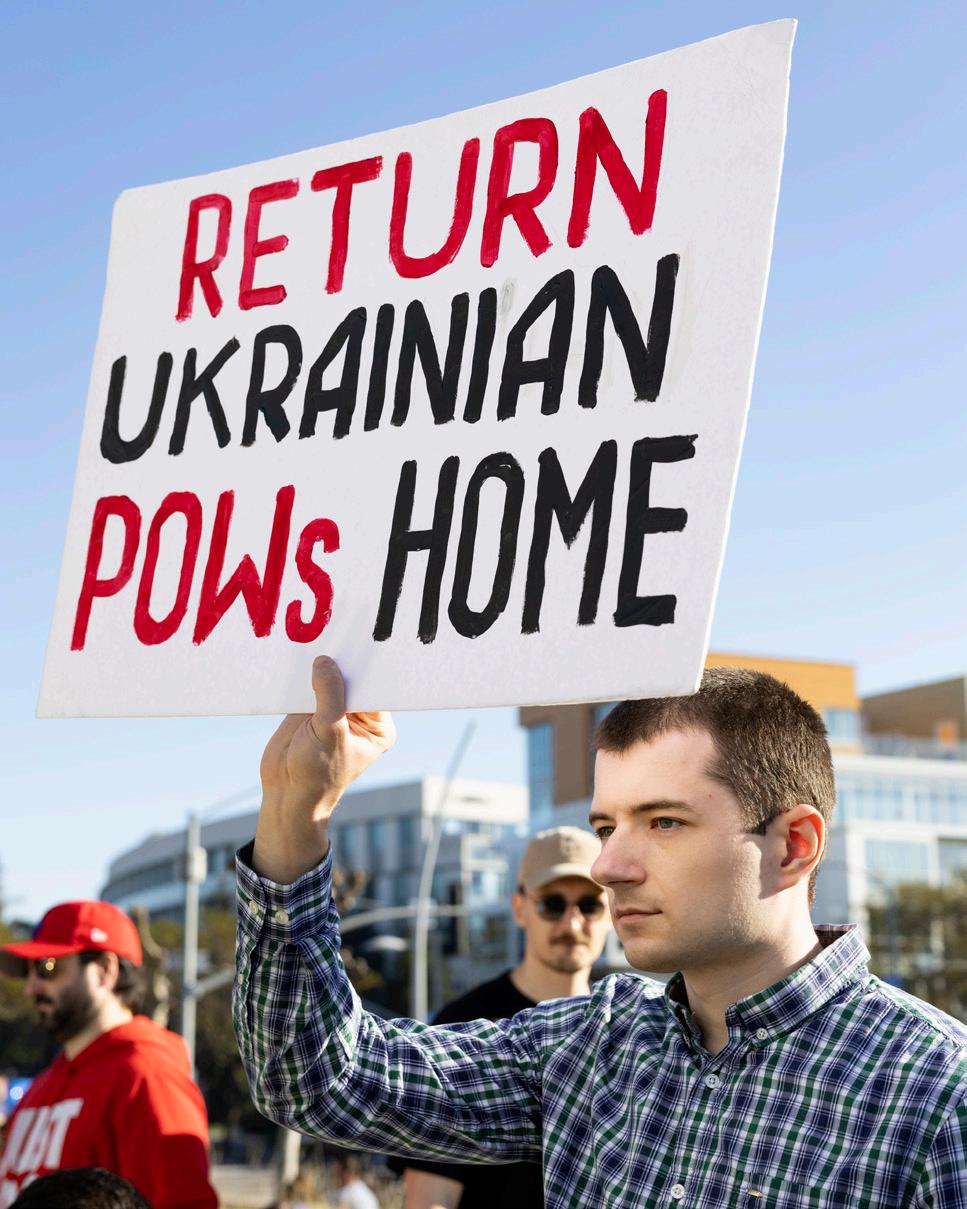 A Ukrainian supporter holds up a sign that states, “Return Ukrainian POWs home,” at the Remembrance Rally, hosted by Stand with Ukraine on the third anniversary of Russia’s invasion of Ukraine at Santa Monica City Hall in Santa Monica, Calif. on Sunday, Feb. 23, 2025. The rally was held to highlight the ongoing occupation of Ukraine. (Jake Crandall | The Corsair)