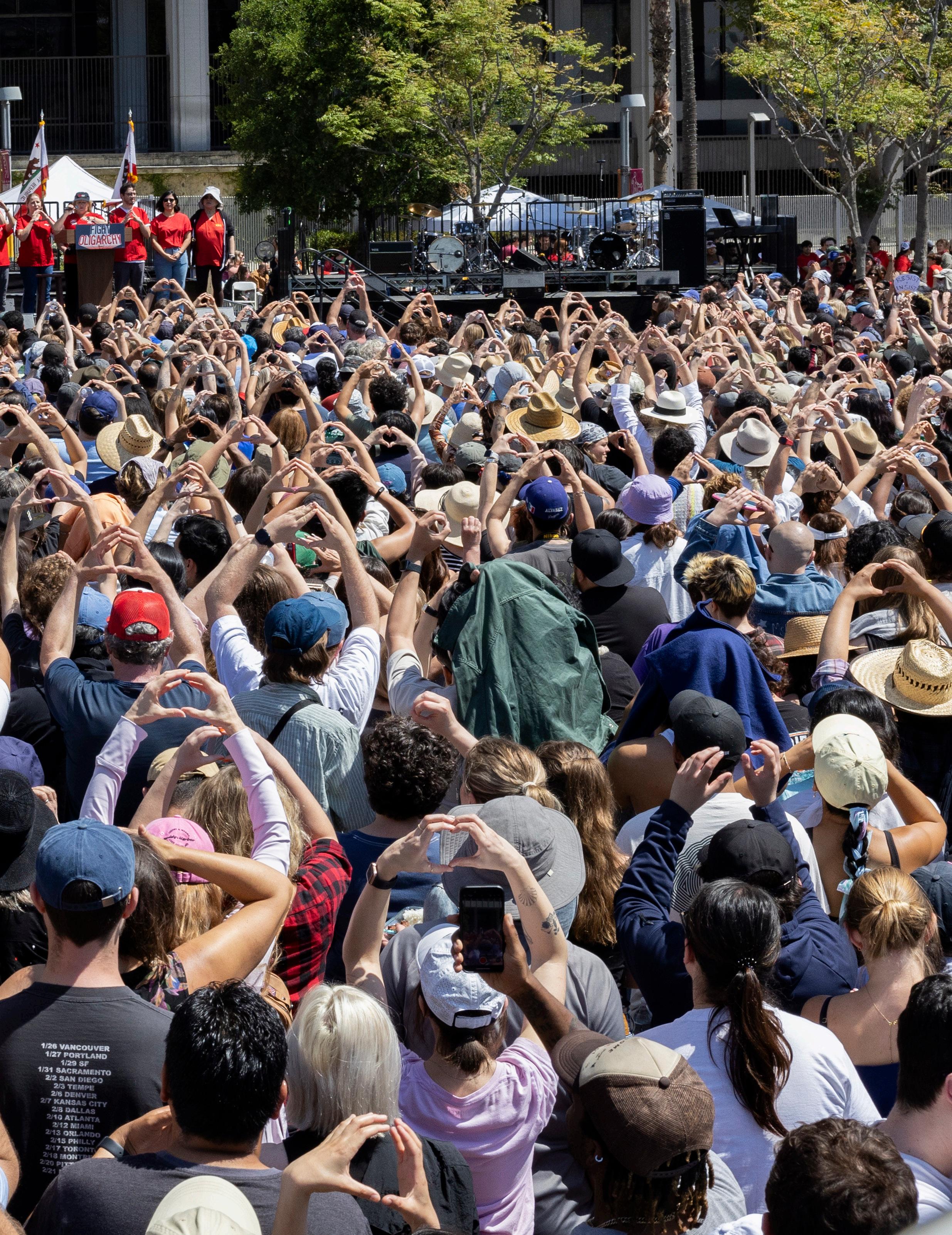 Saturday, the Los Angeles leg of Sen. Bernie Sanders’ Fight Oligarchy speaking tour made a roar downtown, filling Gloria Molina Grand Park and backing up the steps of LA City Hall. Clamoring for space, some guests sprawled upwards, climbing up trees or atop playground structures for a better view. With free admission; no banners, signs, or bulky backpacks allowed; and militantlyplaced fencing enclosing the audience, the Park was packed with 36,000 people in close, sun-baked proximity.