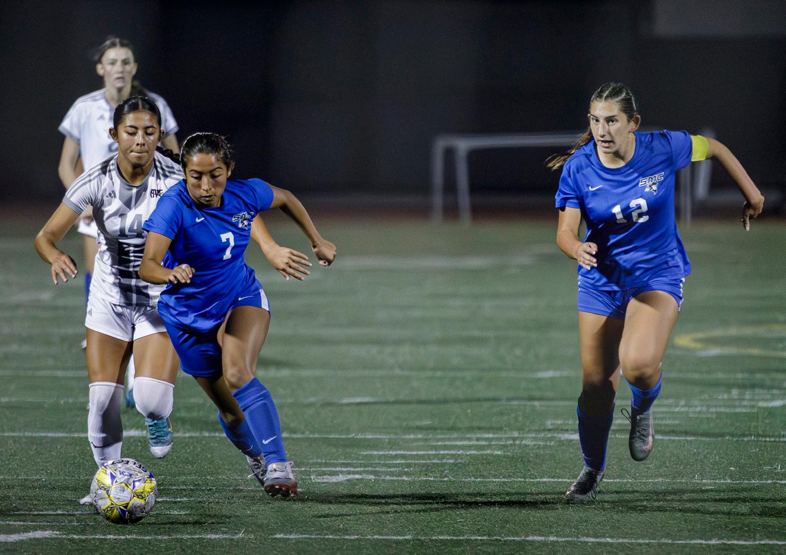 (L-R) Dyleane Silva #14 of the AVC Marauders, Lyric Gomez-Muniz #7 & (team captain) Alysa Bagdasaryan #12 of the SMC Corairs Gomez-Muniz #7 Drives the ball towards goal with Bagdasaryan #12 Overlapping as the defender Silva #14 tries to steal Danny Sanchez | Corsair