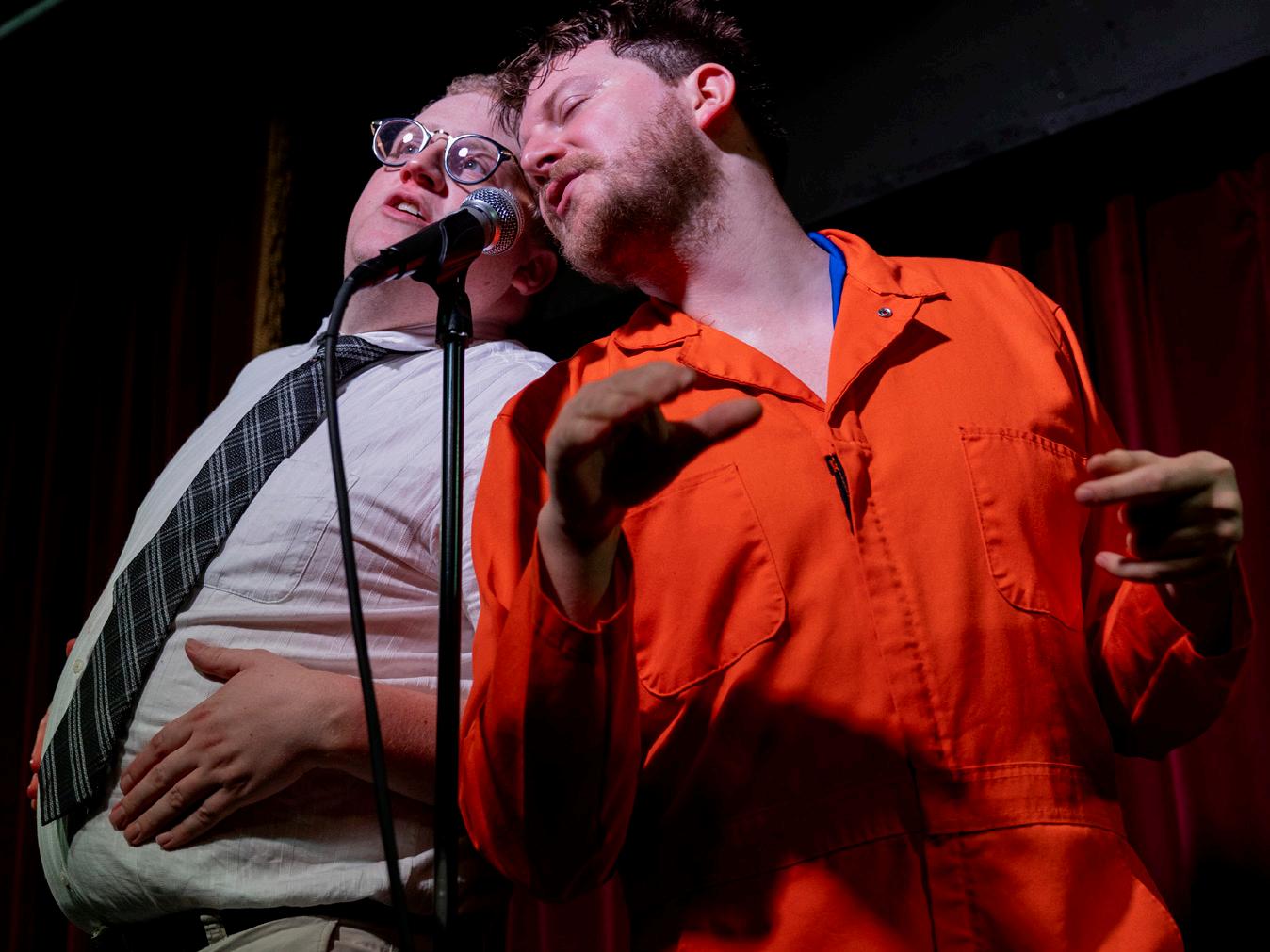 Michael Wysong (Left) and John Lampe (Right) sing at the Lyric Hyperion in Los Angeles during the TUNEabomber, a Unabomber-inspired two-man musical comedy. (Kayjel J. Mairena | The Corsair)