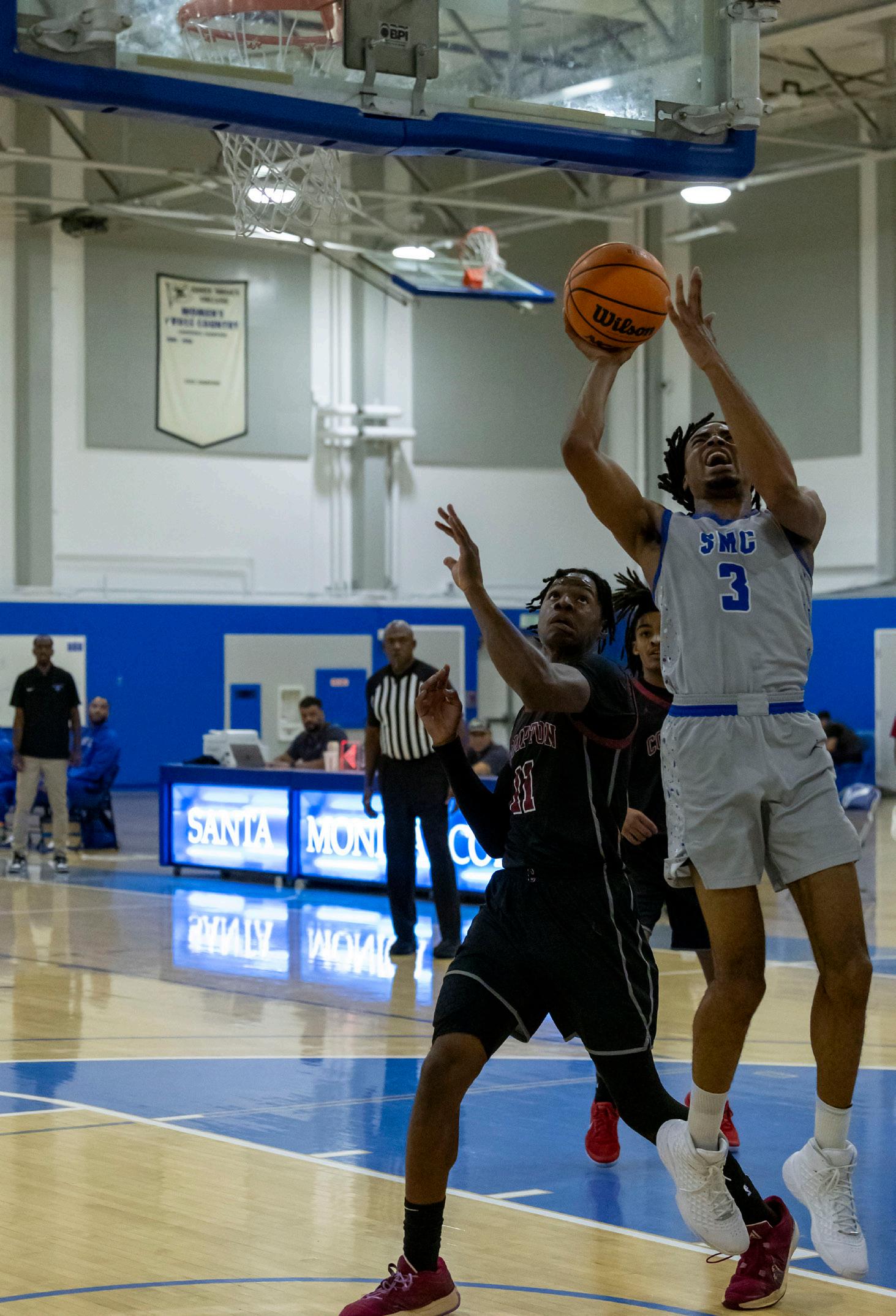 Santa Monica College (SMC) Corsair basketball player Michael Kalu(#3) is attempting a shot during the SMC men’s basketball match against Compton College at Corsair Gym, Santa Monica, Calif., Nov. 7, 2025. The Corsair won 82-67 Masie Najafi | The Corsair