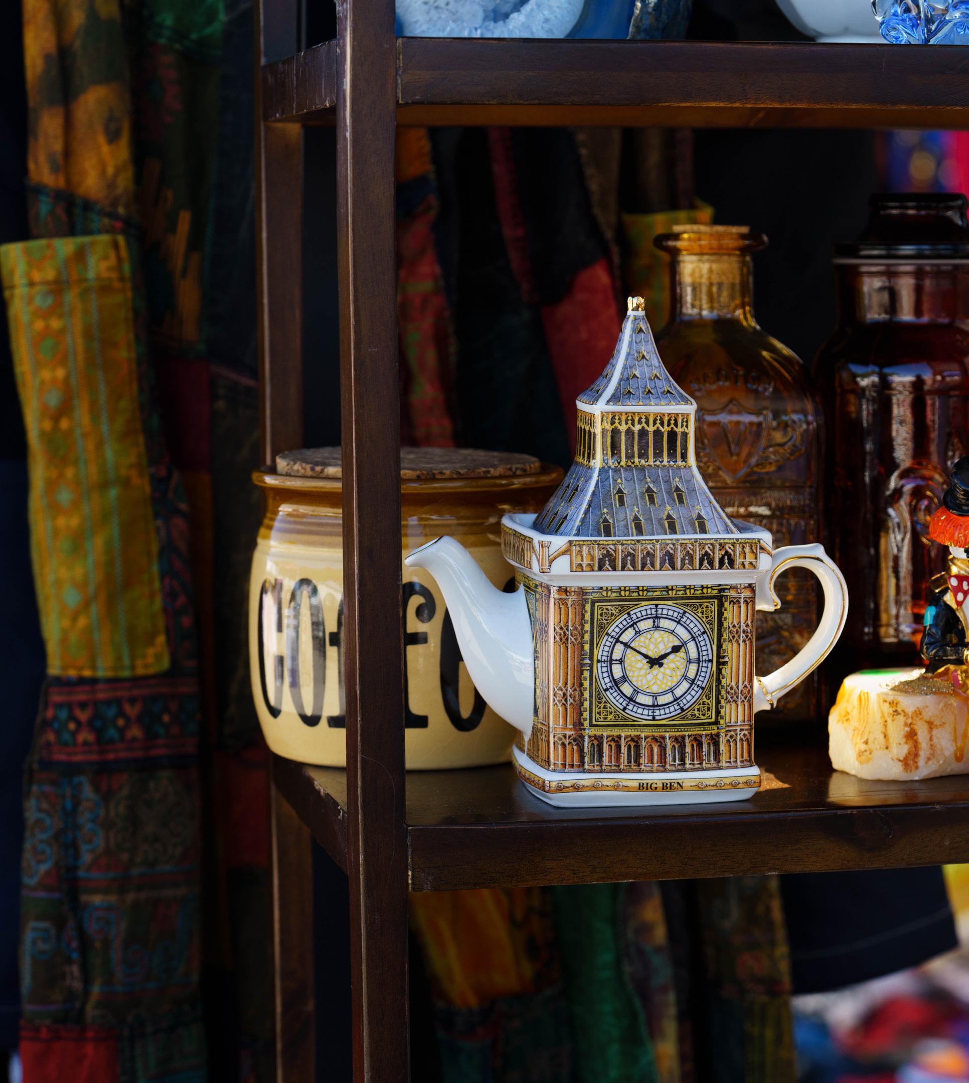 A vintage teapot portraying Big Ben, curated by vendor Fernando Gutierrez, at Melrose Trading