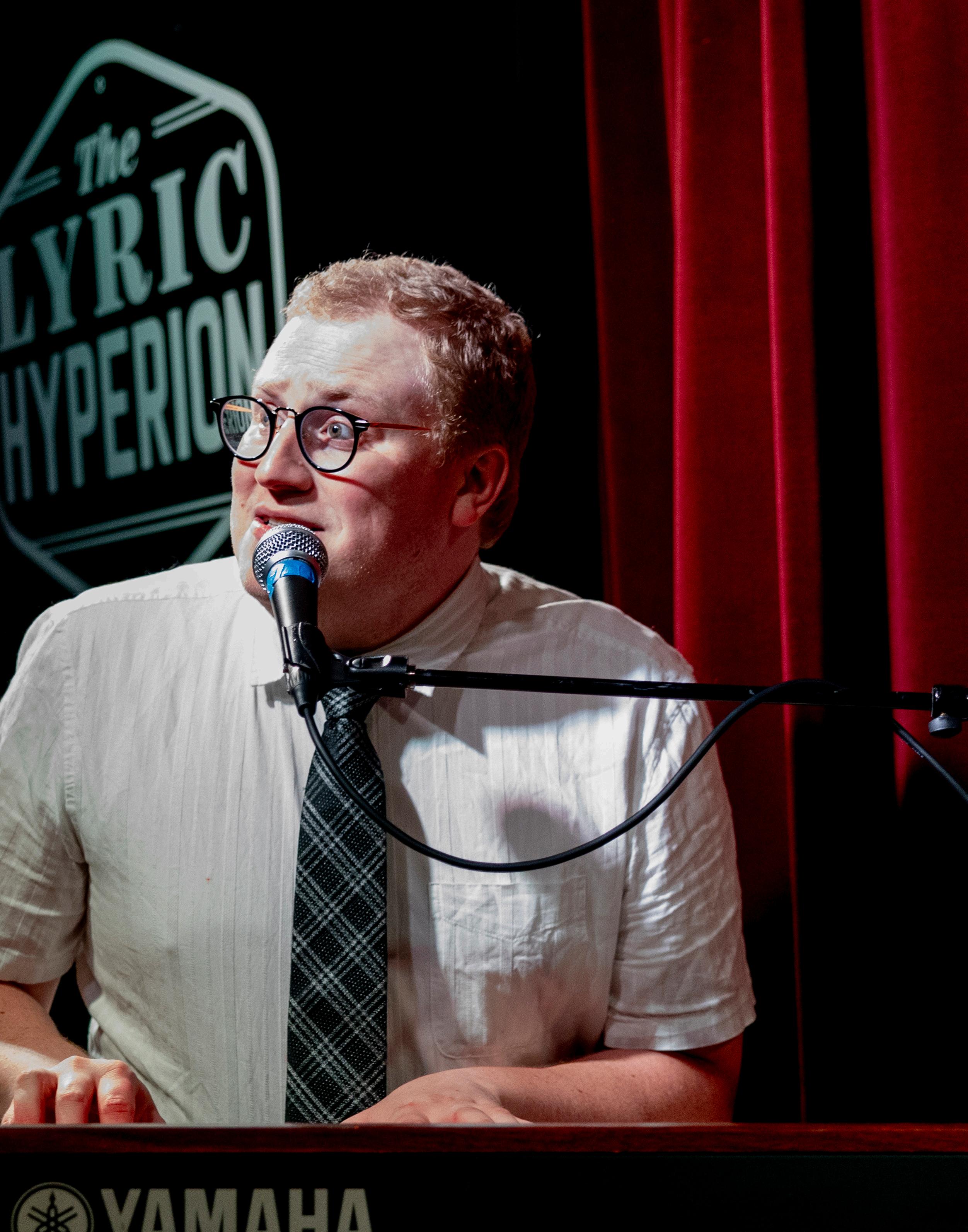 Michael Wysong plays the piano dressed as Ted Kaczynski’s lawyer at the Lyric Hyperion in Los Angeles on Sunday, Nov. 2, 2025, in the two-man musical comedy “The TUNEabomber.”