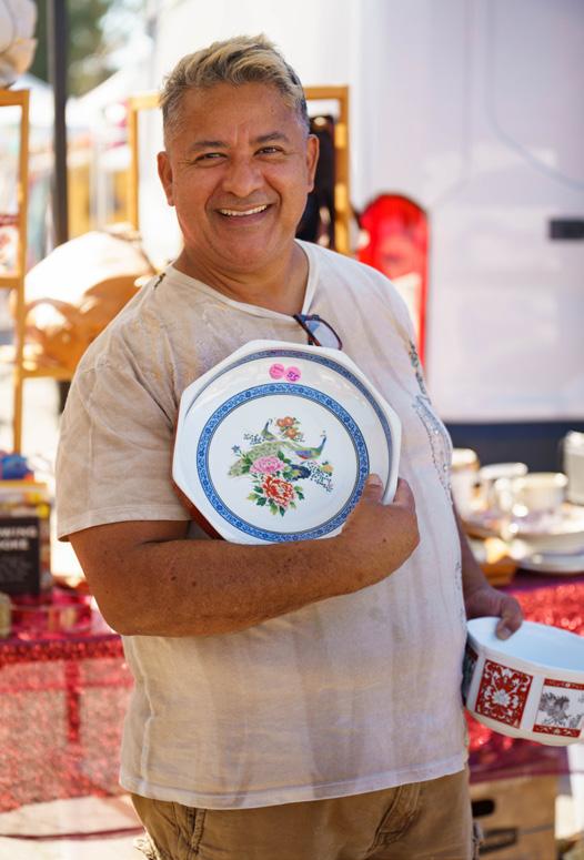 Vendor Fernando Gutierrez holds a vintage Japanese serving bowl from the 1950s