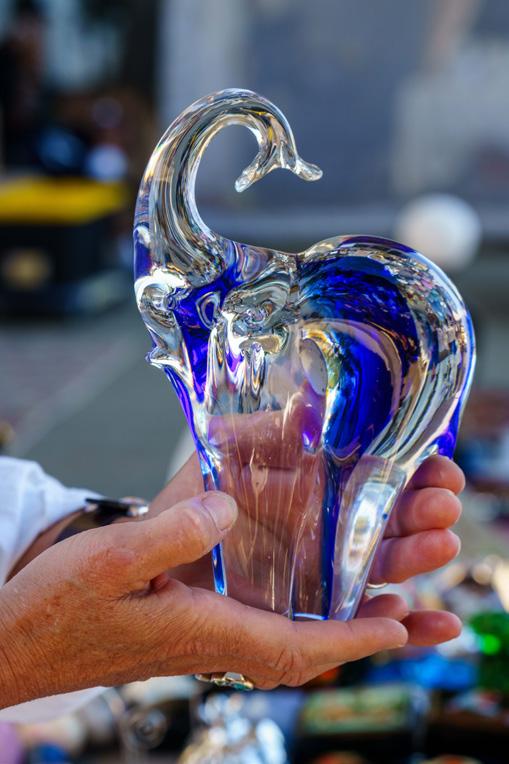 Santa Monica College (SMC) fashion professor Susan Kolko holds a glass elephant curated by Graf vendor Hrachik Atoyan