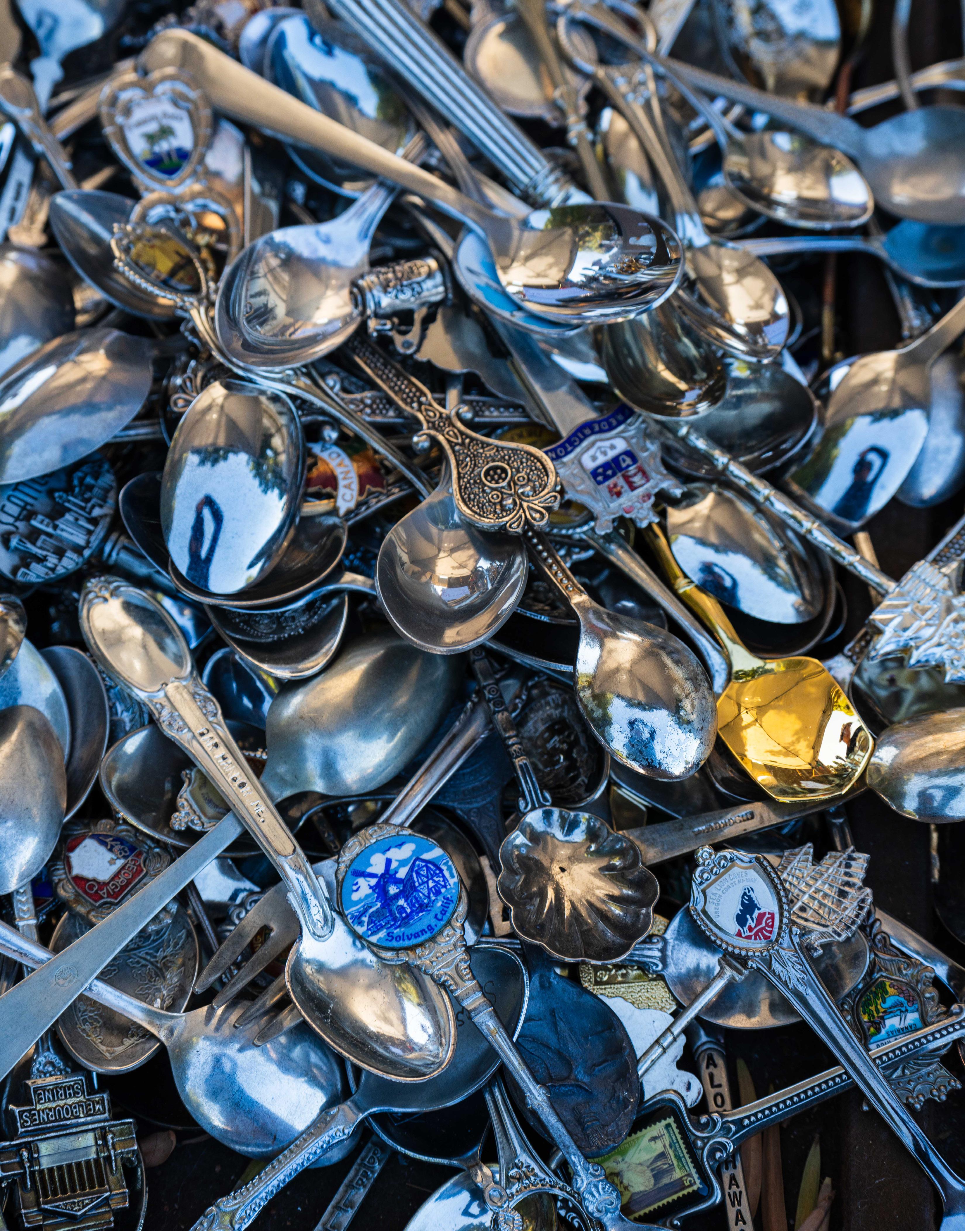 A collection of vintage spoons curated by Graf vendor Hrachik Atoyan at Melrose Trading Post, located at Fairfax High School in Los Angeles, Calif., during a Santa Monica College (SMC) fashion department field trip for SMC students on Sunday, Nov. 9, 2025. The artisan flea market is held weekly.