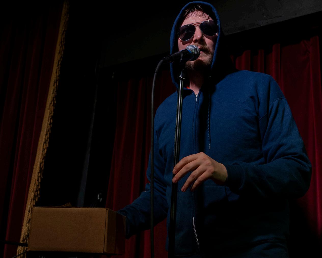 John Lampe holds a box dressed as Theodore Kaczynski at the Lyric Hyperion in Los Angeles during his Unabomber-inspired two-man musical comedy, “The TUNEabomber.” (Kayjel J. Mairena | The Corsair)