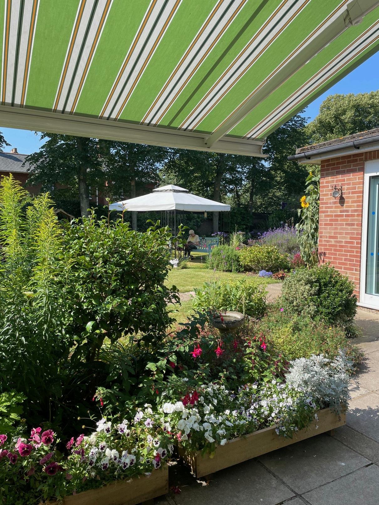 Our beautiful walled garden is secure and safe and many residents are actively involved in its cultivation. It has an accessible pathway and benches for taking a rest in the sunshine. There are a variety of sensory plants, a summer house, and a patio area with tables, seating and retractable sun shades.