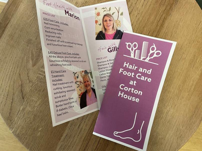 Residents in Corton House now have a choice of two visiting hairdressers and three visiting chiropodists - details of which can be found in our new Hair & Foot Care leaflet (pictured below) which has been distributed to all residents