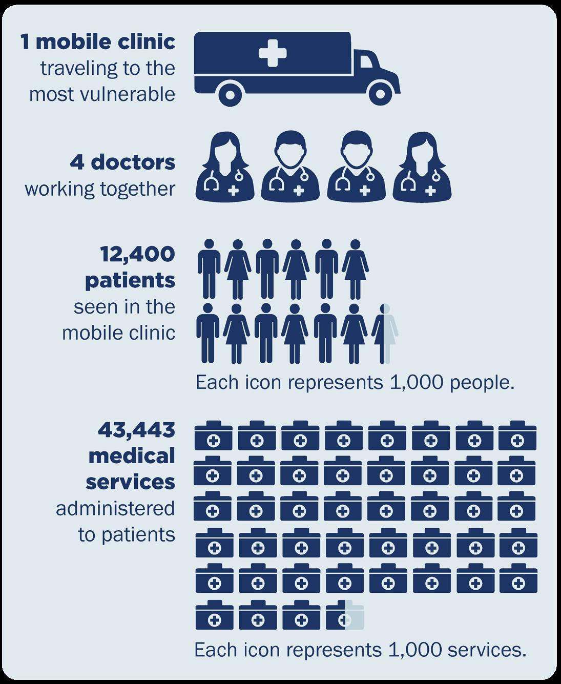 Mobile medical clinic. In hard-hit communities near the frontlines, health care has been hard to access. Because of your generosity, a mobile clinic carries doctors to the people who need them. Located in a tractor-trailer, the mobile clinic has reached more than 12,400 people and provided 43,443 medical services.