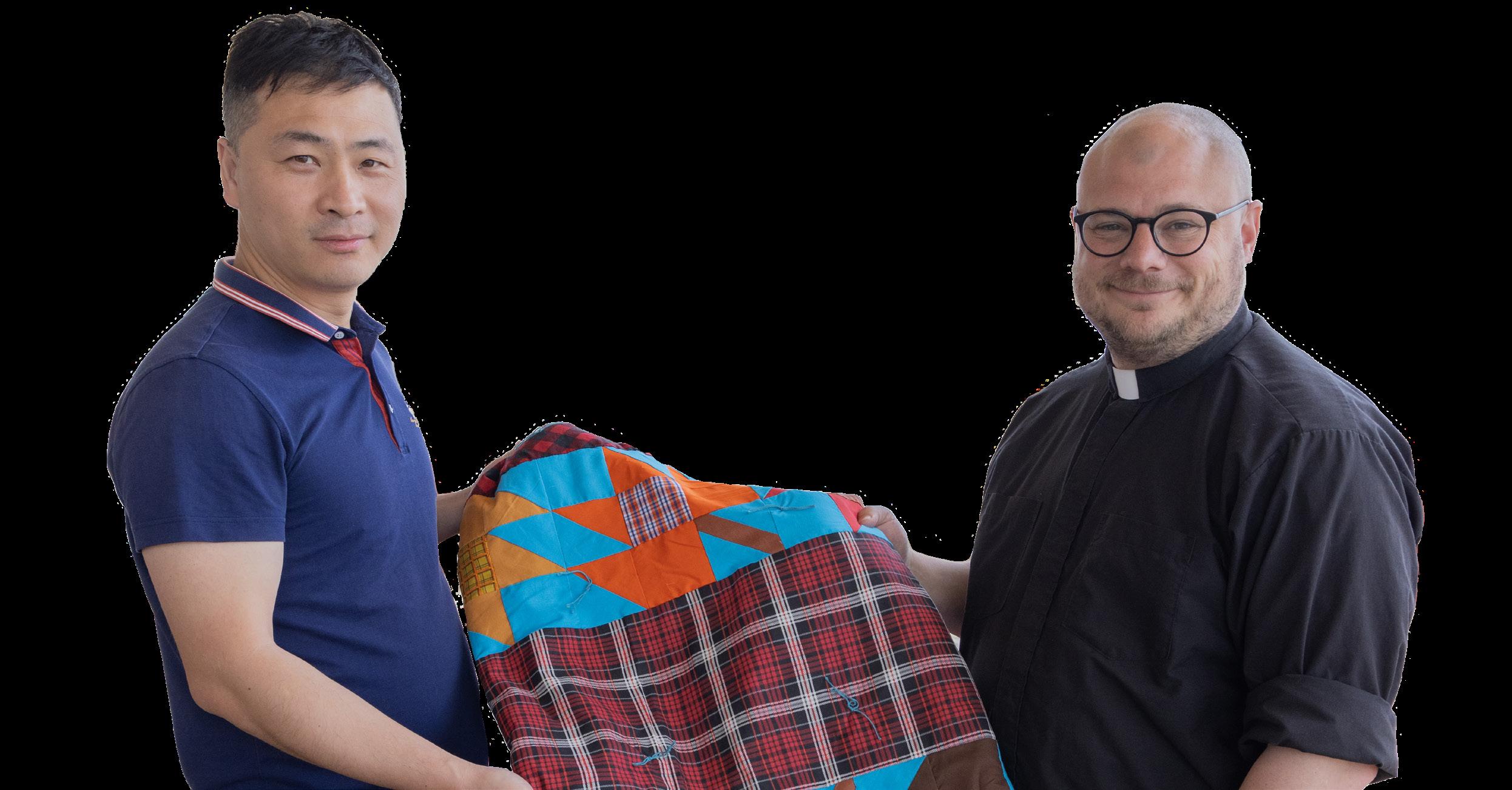 ABOVE: Chief Officer Hu Xin Peng with the Rev. Joshua Messick. Chief Officer Peng welcomed a child two months before his journey. He’s excited to go home and wrap his baby in his new quilt.
