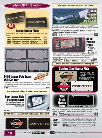 All manufacturer’s names, symbols and descriptions used in this catalog are used for the purposes of identification only. It is neither inferred nor implied that any item offered by CC Industries L.L.C. is a product of, authorized by, or in any way connected with the vehicle manufacturer. The trademarks Corvette, Stingray, Chevrolet, GM, Heartbeat, ZR1, Z06, AC Delco, and the Corvette Emblems are trademarks of General Motors Corporation. The GM Restoration Parts Emblem, Chevrolet, the Chevrolet Bow Tie Emblem, Corvette, Corvette Emblems, Vette and applicable vehicle body designs are trademarks of General Motors Corporation and used under license to CC Industries L.L.C., d/b/a Corvette Central.