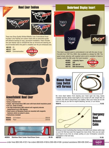 This black carpeted panel is embroidered in red with the year of your Corvette from 1997 thru 2004. Also available is a design for Z06. The panel simply attaches with supplied velcro and is carpeted in black to closely match the GM under the hood insulator. ONLY 465062 HSpecify YearH $ 42.95 465065 Z06 465086 Z06 405 HP EACH 465116 50th Anniversary