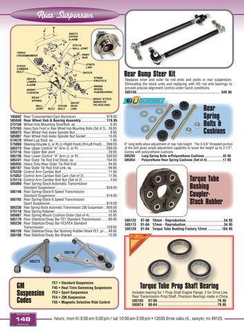 185042 Rear Crossmember-Cast Aluminum................................. 979.00 585048 Rear Wheel Hub & Bearing Assembly..................... 119.95 575158 Wheel Hub Mounting Stud/Bolt, ea...................................... 6.95 575163 Heavy Duty Front or Rear Wheel Hub Mounting Bolts (Set of 3)... 39.95 585073 Rear Wheel Hub Axles Spindle Nut...................................... 8.95 585007 Rear Wheel Hub Axles Spindle Nut Socket........................ 15.95 574570 Wheel Lug Stud, ea.............................................................. 1.95 575069 Steering Knuckle (L or R) (L=Right Front) (R=Left Front)......399.00 585273 Rear Upper Control “A” Arm (L or R).............................. 299.00 575116 Rear Upper Ball Joint......................................................... 29.95 585136 Rear Lower Control “A” Arm (L or R).............................. 549.00 585241 Rear Outer Tie Rod End Stock, ea. .................................. 104.95 585035 Heavy Duty Rear Outer Tie Rod End ................................. 44.95 585187 Rear Outer Tie Rod End Link, ea. ...................................... 99.95 575220 Control Arm Camber Bolt................................................... 11.95 575052 Control Arm Camber Bolt Cam (Set of 2)........................... 17.95 575114 Control Arm Camber Bolt Nut (Set of 2).............................. 3.50 585060 Rear Spring-Stock Automatic Transmission Standard Suspension....................................................... 859.00 585146 Rear Spring-Stock 6 Speed Transmission Standard Suspension....................................................... 819.00 585192 Rear Spring-Stock 6 Speed Transmission Sport Suspension............................................................. 819.00 585230 Rear Spring-Stock Automatic Transmission Z06 Suspension... 859.00 575118 Rear Spring Retainer.......................................................... 10.95 585087 Rear Spring Mount Cushion-Outer-(Set of 4).................... 55.95 585179 Rear Stabilizer/Sway Bar FE1 Standard Transmission........ 89.95 585236 Rear Stabilizer/Sway Bar FE3/FE4 Standard Transmission.................................................................... 159.95 585120 Rear Stabilizer/Sway Bar Bushing Rubber-Stock FE1, pr..... 48.95 585108 Rear Stabilizer/Sway Bar Bracket....................................... 12.95
