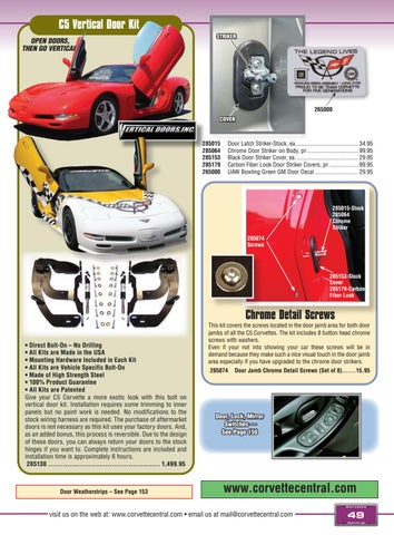 Door Latch Striker-Stock, ea........................................... 34.95 Chrome Door Striker on Body, pr................................... 99.95 Black Door Striker Cover, ea........................................... 29.95 Carbon Fiber Look Door Striker Covers, pr..................... 99.95 UAW Bowling Green GM Door Decal.............................. 29.95