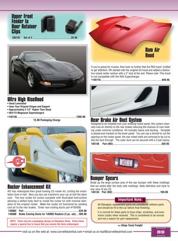 ACI has redesigned their great looking C5 rocker kit, cutting the installation time in half. Now you too can transform your car at half the labor cost. The new rocker kit comes complete with illustrated instructions allowing a skilled body tech to install the rocker kit with minimal alteration to the original rocker. Make the rocker kit functional by sending cool air to the rear brakes. Order rear cooling ducts part #145008. 145003 Pair..............................................................629.00 145008 Brake Cooling Ducts for 145003 Rockers (2 pc. set)....389.00 NOTE: There may be a packaging charge on fiberglass items. Some items require a special box to insure that you receive the items undamaged.