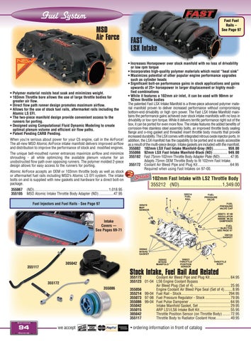 FAST LSX Intake • Increases Horsepower over stock manifold with no loss of drivability or low rpm torque • Incorporates high-quality polymer materials which resist “heat sink” • Maximizes potential of other popular engine performance upgrades such as cylinder heads • Significant bolt-on performance gains in stock applications and gains upwards of 25+ horsepower in larger displacement or highly modi- fied combinations • While it features a 102mm air inlet, it can be used with 90mm or 92mm throttle bodies The patented Fast LSX Intake Manifold is a three-piece advanced polymer material manifold proven to deliver increased performance without compromising bottom-end drivability or high rpm power. The Fast LSX Intake Manifold maintains the performance gains achieved over stock intake manifolds with no loss in drivability or low rpm torque. While it delivers terrific performance right out of the box, it can be ported for even more flow. The intake features the added benefits of corrosion-free stainless steel assembly bolts, an improved throttle body sealing flange and o-ring gasket and threaded insert throttle body mounts that provide increased durability. The LSX comes with integrated nitrous oxide injector ports. In addition, the LSX manifold has the capability to be ported and is easily accessible as a result of the multi-piece design. Intake gaskets are included with the manifold. 355082 102mm LSX Fast Intake Manifold-Gray (ND)............ 959.00 355066 92mm LSX Fast Intake Manifold-Black (ND)............ 949.00 355182 Fast 75mm-102mm Throttle Body Adapter Plate (ND)............. 47.95 Adapts 75mm OEM Throttle Body to fit 102mm Fast Intake. 355172 Coolant Air Bleed Pipe and Plug Kit...................................64.95 Required when using Fast Intakes on 97-00.