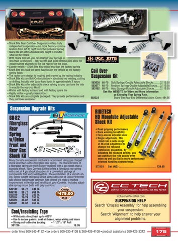 Coil Over Suspension Kit 583038 68-79 Soft Springs-Double Adjustable Shocks.......... 2,119.95 583077 68-79 Medium Springs-Double AdjustableShocks..... 2,119.95 583102 68-79 Hard Springs-Double Adjustable Shocks......... 2,119.95 See Our WEBSITE for Video and More Information on Choosing Your Spring Rate. 582222 Shark Bite Rear End Differential Alum. Cover.. 484.95