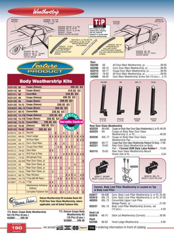 Coupe (Deluxe) 499.95 Kit Coupe (Basic) 419.95 Kit Covertible 249.95 Kit Coupe (Deluxe) 499.95 Kit Coupe (Basic) 399.95 Kit Coupe (Deluxe) 399.95 Kit Coupe (Basic) 369.95 Kit Convertible 239.95 Kit Coupe (Deluxe) 329.95 Kit PECIA Coupe (Basic) 289.95 Kit Convertible 199.95 Kit Corvette Central (Deluxe) 369.95 Kit PR ICE (Basic) 289.95 Kit Decklid X X X Hood Ledge X X X X X X X X X X X X X All Door Main X X X Conv. Door Main X X Coupe Door Main X X X X X X Door Main X X W/S Post & Pillar X X X X X X X X Windshield Post X X X X X Rear Door Glass, pr. X Rear Door Glass, pr. X Rear Door Glass, pr. X X Rear Door Glass, pr. X Rear Window X X X X X X T-Top (68-69 Repl.) X X X X X X X X T-Top X X Weatherstrip Adhesive X X X X X X X X X X X X X (Yellow) Complete Fastener Set X X X X X X X X