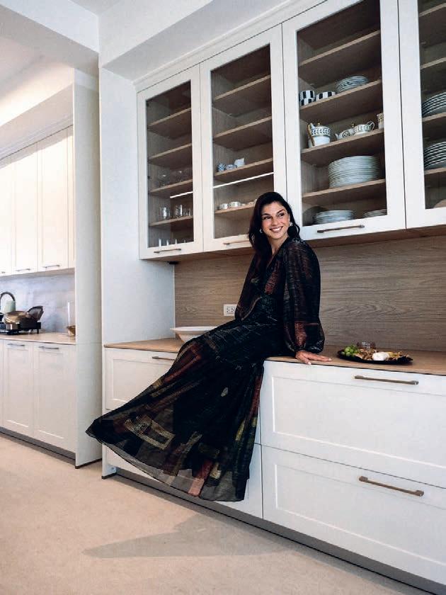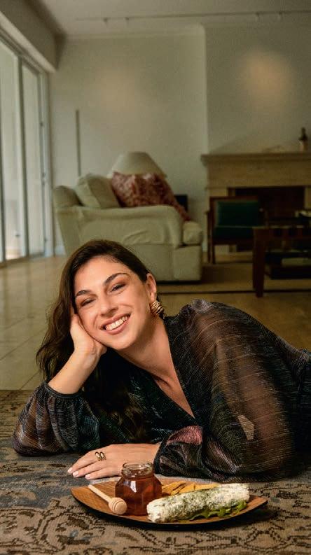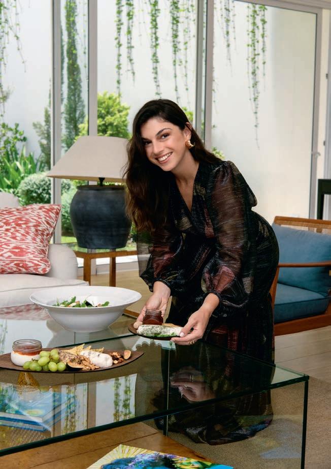 En la sala, el equipo de fotografía instala luces y cámaras, midiendo ángulos y buscando el mejor lugar para retratarla. Entre tanto movimiento aparece su madre, Tania Jelicic –directora creativa y fundadora de la marca peruana Balkanica– con una tabla generosa de quesos, jamones, frutos secos y pequeños panes recién abiertos. La escena tiene algo de reunión familiar improvisada: conversaciones que se cruzan, el sonido del mar de fondo y una atmósfera donde se mezclan trabajo y complicidad.