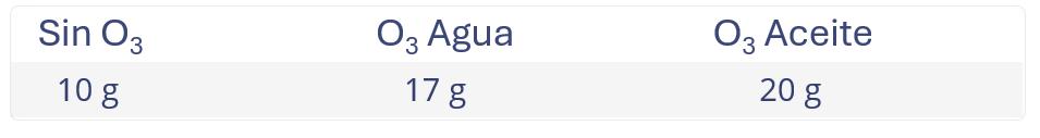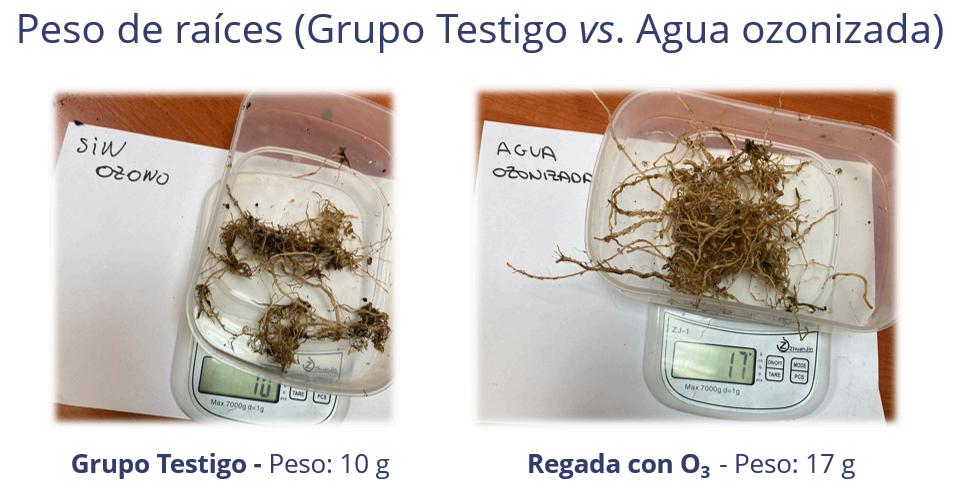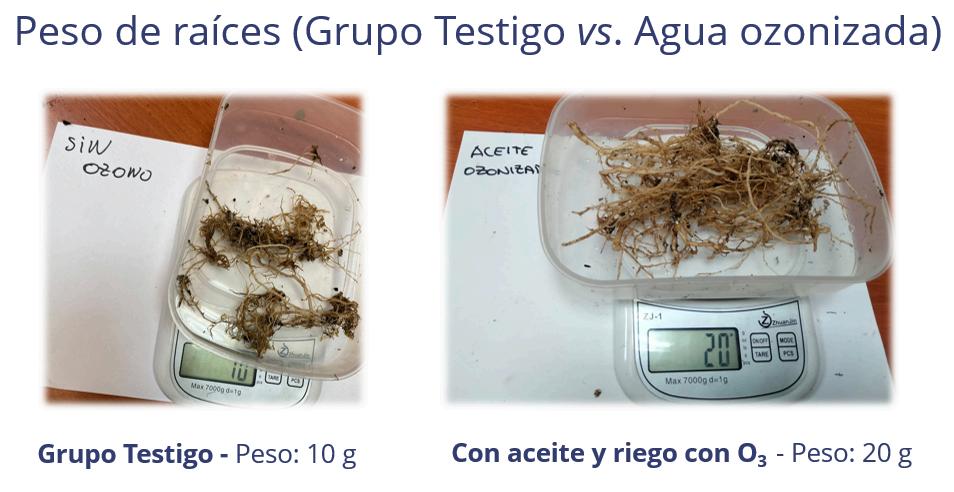 También pudimos comprobar las diferencias en el peso de las raíces de las mismas plantas, tras la aplicación de agua ozonizada y aceite ozonizado