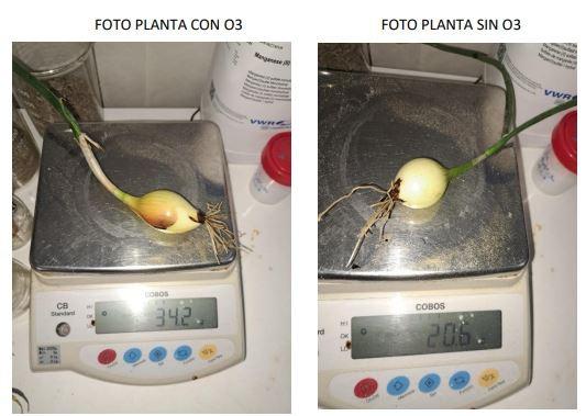 Se observa cómo el bulbo de la cebolla tratada con agua ozonizada es mayor: pesa 34,2 g frente a los 20,6 g de la cebolla sin tratar.