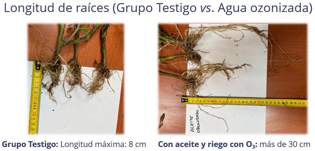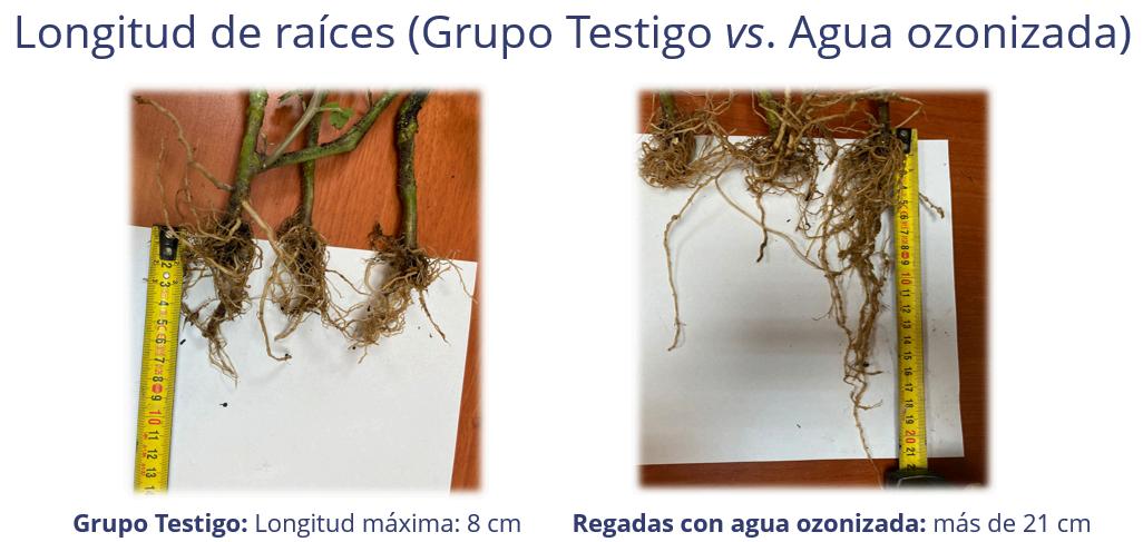 Por supuesto, es mucho más evidente en los suelos con más tendencia a secarse, pero el hecho es que, invariablemente, el agua ozonizada favorecía la humedad del sustrato a la vez que fomentaba el desarrollo radicular