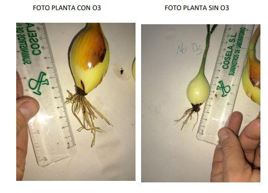 Se han arrancado las cebollas tratadas y testigo, y se aprecia cómo la tratada con ozono tiene mayor tamaño de raíz, de unos 5cm desde la base, y se más poblada. Por el contrario, la raíz de la cebolla testigo, regada con agua sin ozono, ha medido unos 3 cm, y está menos poblada.