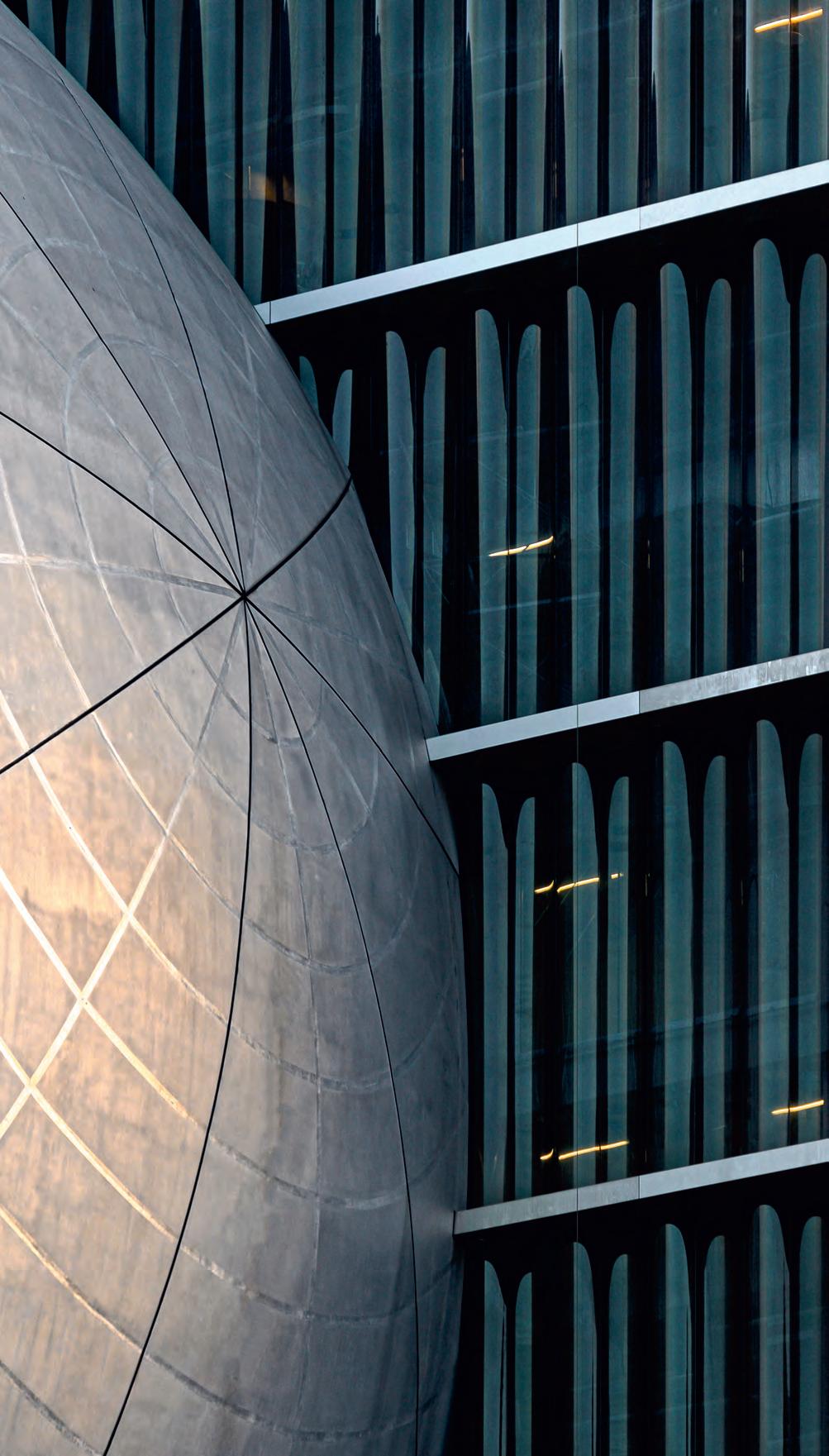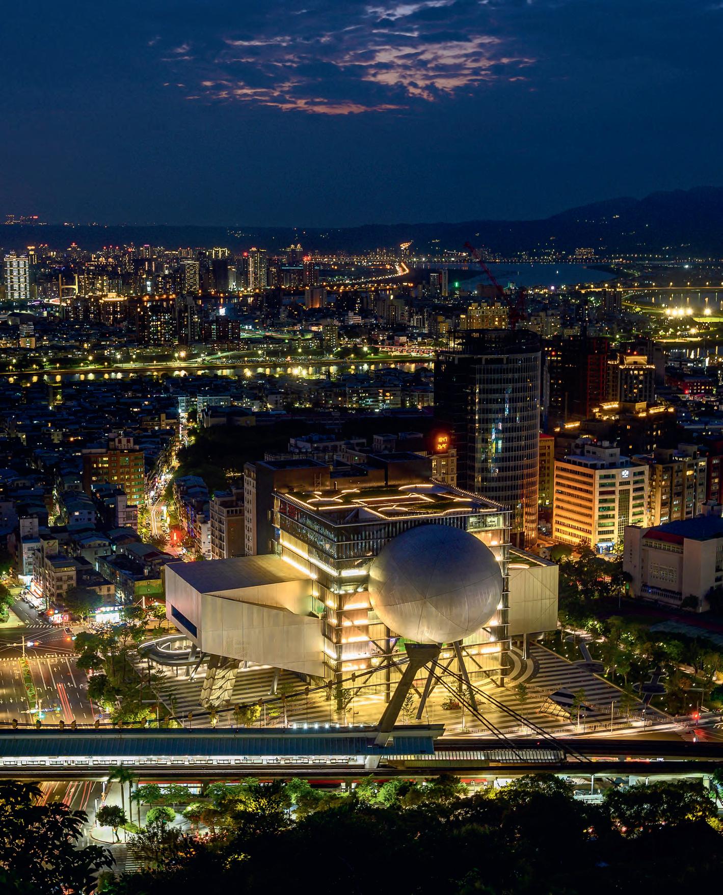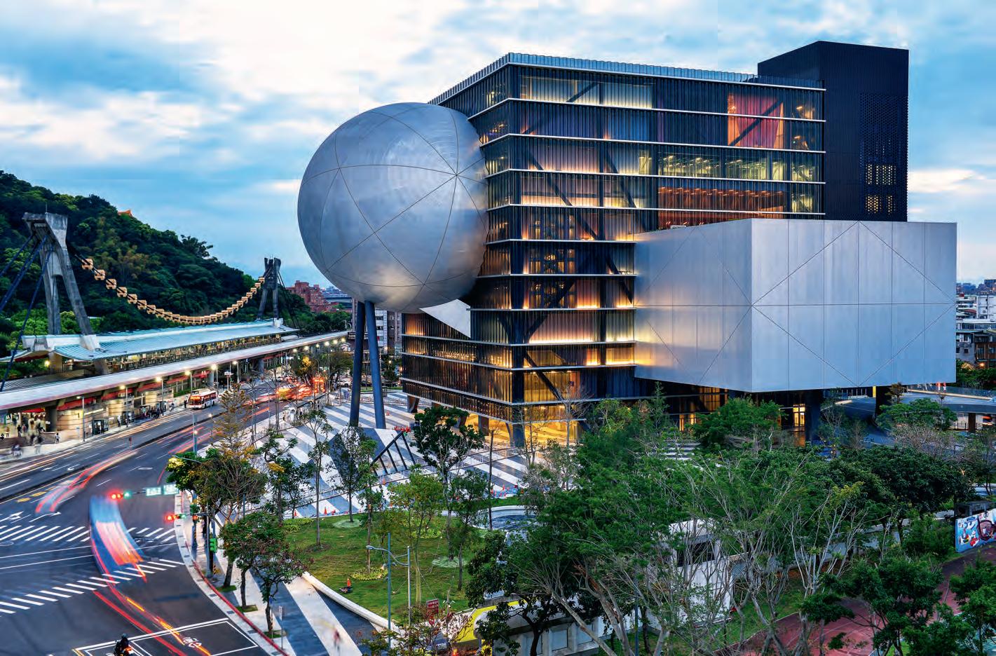 The Taipei Performing Arts Center is formed by a cubic vol ume’s interlocking with three different auditorium types: a sphere seating an audience of 800 and two asymmetrically positioned rectangular boxes taking in 1,500 and 800 spectators. The central cube contains the stages and also all stage machinery, technical rooms, and circulation cores, making it possible for the auditori ums to be modified or even joined, adapting to a variety of uses and performances. The arrangement is reflected on the facades. While the auditoriums are blind, opaque volumes, the cube in the middle has a glass enclosure, and is raised above the ground to create an extension of the public space, welcoming urban flows and leading people to the shows upstairs.
