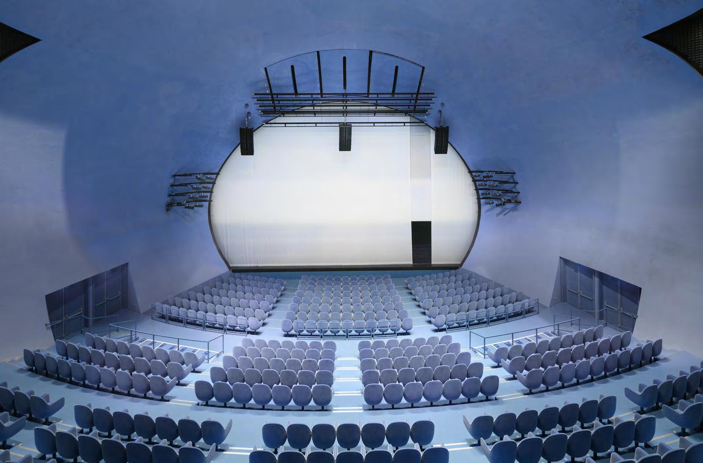 The three auditoriums stick out of different sides of a central cube, and function either separately or in any of different combinations, in accordance with the requirements of the performances on show.