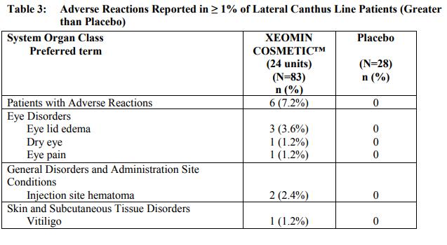 Dry eye has been reported with the use of botulinum toxin products in the treatment of glabellar lines. Reduced tear production, reduced blinking, and corneal disorders may occur with use of botulinum toxins. If symptoms of dry eye (e.g., eye irritation, photophobia, or visual changes) persist, consider referring the patient to an ophthalmologist.