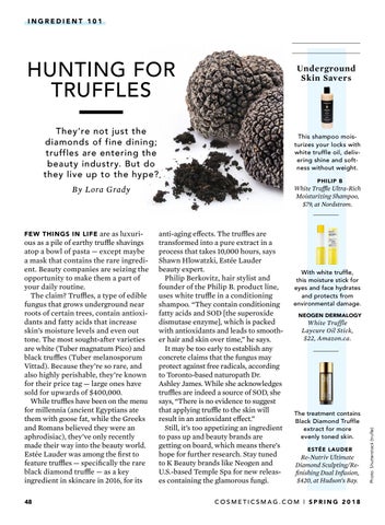 anti-aging effects. The truffles are transformed into a pure extract in a process that takes 10,000 hours, says Shawn Hlowatzki, Estée Lauder beauty expert. Philip Berkovitz, hair stylist and founder of the Philip B. product line, uses white truffle in a conditioning shampoo. “They contain conditioning fatty acids and SOD [the superoxide dismutase enzyme], which is packed with antioxidants and leads to smoother hair and skin over time,” he says. It may be too early to establish any concrete claims that the fungus may protect against free radicals, according to Toronto-based naturopath Dr. Ashley James. While she acknowledges truffles are indeed a source of SOD, she says, “There is no evidence to suggest that applying truffle to the skin will result in an antioxidant effect.” Still, it’s too appetizing an ingredient to pass up and beauty brands are getting on board, which means there’s hope for further research. Stay tuned to K Beauty brands like Neogen and U.S.-based Temple Spa for new releases containing the glamorous fungi.