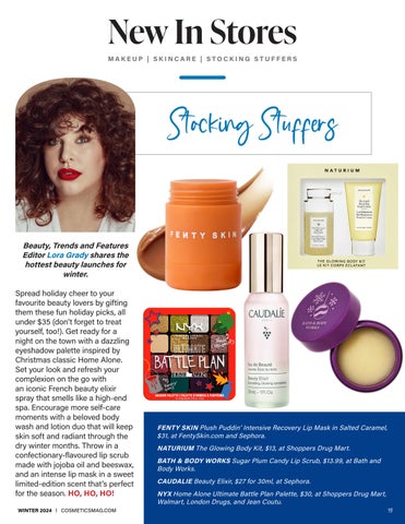 Beauty, Trends and Features Editor Lora Grady shares the hottest beauty launches for winter. Spread holiday cheer to your favourite beauty lovers by gifting them these fun holiday picks, all under $35 (don’t forget to treat yourself, too!). Get ready for a night on the town with a dazzling eyeshadow palette inspired by Christmas classic Home Alone. Set your look and refresh your complexion on the go with an iconic French beauty elixir spray that smells like a high-end spa. Encourage more self-care moments with a beloved body wash and lotion duo that will keep skin soft and radiant through the dry winter months. Throw in a confectionary-flavoured lip scrub made with jojoba oil and beeswax, and an intense lip mask in a sweet limited-edition scent that’s perfect for the season. HO, HO, HO! WINTER 2024 l COSMETICSMAG.COM