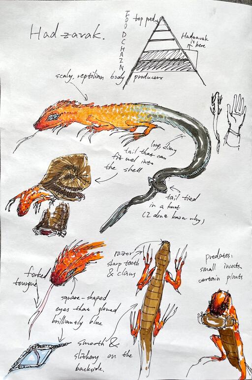 "LookTowardtheDarkness,"anexplorationof darkfiction,wasourfi rstDiscord-based workshopforteenagers.Participantsfrom Kentucky,USAtoNanjing,Chinacollaboratedto writehorrorstoriesandcreatemagicalbestiaries. Oneoftheirmagicalbeastsisfeaturedhere: ahadzavak,inventedbyaPhillyparticipantand illustratedbyoneofherNanjingpeers