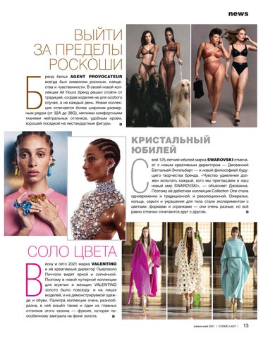 ВЫЙТИ ЗА ПРЕДЕЛЫ РОСКОШИ ренд белья AGENT PROVOCATEUR всегда был символом роскоши, изящества и чувственности. В своей новой коллекции All Hours бренд решил отойти от традиций, создав изделия не для особого случая, а на каждый день. Новая коллекция отличается более широким размерным рядом (от 32A до 38G), мягкими комфортными тканями нейтральных оттенков, удобным кроем, хорошей посадкой на нестандартные фигуры.