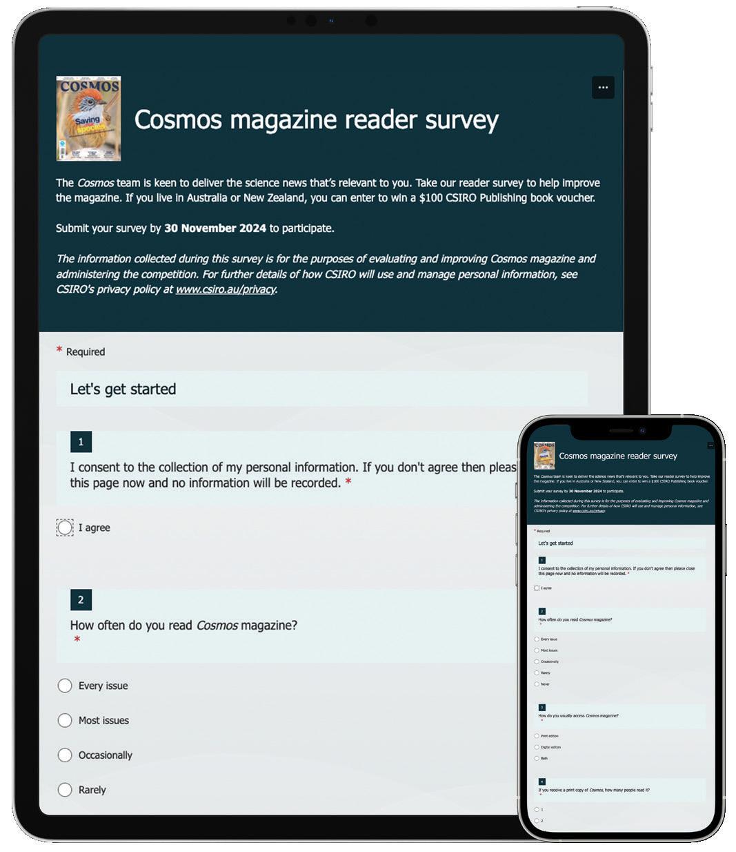 TAKE OUR MAGAZINE READER SURVEY AND SHAPE OUR FUTURE. The information we collect will be used to tailor our upcoming content to meet our community’s needs and interests. If you participate and live in Australia or New Zealand, you could be in the running to win a $100 CSIRO Publishing book voucher. Find the survey at https://link.cosmosmagazine.com/survey-2024 and submit your answers by 30 November 2024. We look forward to hearing your thoughts and ideas for Cosmos.