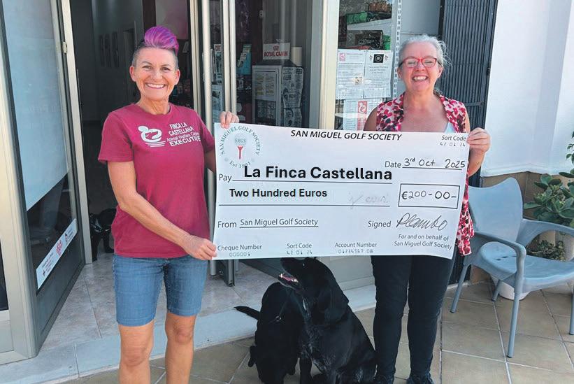 donation of €200 to the local animal rescue charity, La Finca Castellana. They do amazing work in San Miguel de Salinas rescuing all animals and birds. They have many dogs, cats, birds, donkeys, hedgehogs and horses – to name a few. Their work is incredible and they give great care to all their “visitors”. They are always looking for volunteers and donations. Pictured below is our Secretary, Sandra Dibble, with Becky who manages La Finca Castellana – Brady & Barney just happened to be visiting Edouardo’s Vets and wanted to get in on the action too. Thanks to all our members for their blob donations.