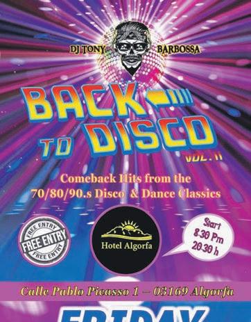 2 www.costablancapeople.com CostaBlancaPeople 26th March - 1st April 2024 CALL TO RESERVE YOUR TICKETS 966 729 707 SHOWING ALL YOUR LIVE SPORTS ON OUR 4 SCREENS - ASK STAFF FOR YOUR MATCH TO BE SHOWN e best sunset views on the Costa Blanca. Join us on the terrace at sunset for a Piña Colada. Calle Pablo Picasso 1, Castillo de Montemar, Algorfa 03169 Tel: 966 729 707 Email: reservations@hotelalgorfa.es Book your stay directly with us for 10% OFF YOUR BOOKING PRICE. Enjoy a night of entertainment & an overnight stay to save the stress of a taxi home! Twin rooms, family rooms, suites with mountain view or self catering apartments available. Recently refurbished and modernised. A TASTE OF THE BRITISH SEASIDE Every Friday WITH OUR CHIP SHOP MENU FROM 2PM from 1pm JUST €8,99 Starters & Desserts available to order FRESHLY COOKED HOMEMADE MEALS Kitchen Open 8am-9pm ALL DAY EVERYDAY FULL ENGLISH BREAKFAST FROM 2,50 SUNDAY CARVERY Charity Band Sunday 14th April from 5.00pm FREE ENTRY Saturday 30th March - 8pm €10 including pint of draught, glass of wine or soft drink FRIDAY 5TH APRIL start 8.30pm FREE ENTRY Sunday 7th April 5.30pm FREE ENTRY SOULFULLY YOURS Saturday 13th April 8.30pm €10 a ticket 1036 Saturday 20th April 8.30pm €10 a ticket inc drink 21st April - 8.30pm Robert Knight A night of Motown FREE ENTRY