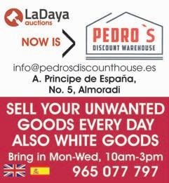 4 www.costablancapeople.com CostaBlancaPeople 7th - 13th March 2023 EXPAT BRIEFINGS To register for any event visit: www.expatbriefings.com FREE Practical Advice for People in Spain - Moving here - Living here - Spending more time here? “Residency/Visas - What are the rules/requirements?” “What are my obligations if I retire to Spain?” Wills, Inheritence & much more! “What are my options if I sell my house in the UK?” “How much time can I spend in Spain without a VISA?” “Will I qualify for State Healthcare?” “How does the funeral system work in Spain?”... • Wed, 8th March - surfers Bar, Playa Flemnca Beach - 10.30am • Thurs, 9th March - Portobello, Pinar de Campoverde - 10.30am • Wed, 15th March - The Bistro, La Finca, Algorfa - 10.30am Limited places at all events, booking is essential. You can book your places by email, telephone or scan the QR code to go the website. COMPLIMENTARY BREAKFAST YOUR CHANCE TO ASK THE QUESTIONS THAT MATTER TO YOU: JOIN US AT THESE LOCAL VENUES: +34 965 02 03 44 info@expatbrie ngs.com EXIT AT JUNCTION 523 AND TAKE THE SLIP ROAD AFTER THE SECOND ROUNDABOUT Automóviles Crespo S.A. Avda de Crevillente 71, Elche 03293 96 666 22 60 - 606 994 076 www.automovilescrespo.com FORD STORE FORD FIESTA LIMITED EDITION PETROL 2020 14.900€ FORD FOCUS TREND+ PETROL 2019 18.900€ FORD FOCUS ST-LINE X PETROL AUTO 2021 25.500€ FORD GRAND C-MAX DIESEL 7 SEATS 2016 17.500€ FORD ECOSPORT TITANIUM PETROL 2020 19.500€ FORD KUGA TREND+ PETROL 2019 22.900€ FORD KUGA VIGNALE DIESEL 4WD AUTO 2016 24.500€ FORD EDGE ST-LINE DIESEL 4WD AUTO 2017 32.900€ FORD TOURNEO COURIER SPORT PETROL 2019 17.500€ AUDI Q3 1.5TFSI S-TRONIC PETROL AUTO 2019 35.900€ FORD KUGA TITANIUM PETROL AUTO 176HP 2019 25.900€ PEUGEOT TRAVELLER DIESEL 9 SEATS 2021 34.500€ AUTOMÓVILES CRESPO THE BIGGEST AND BEST FOR PRICE CHOICE AND QUALITY 982 LIMITED STOCK ON REDUCED PRICED DEMO CARS
