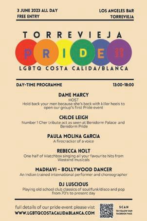 back to the community, the day will be a charitable one in aid of Samaritans in Spain and the elche Childrens Care home. Please visit our website www. lgbtqcostacalidablanca.com where you will find a full list of our entertainment with times and links for all our sponsors. Food and drinks will be available at the venue.