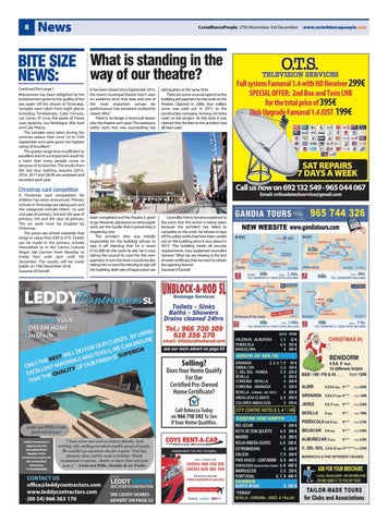 BITE SIZE What is standing in the way of our theatre? NEWS: Continued from page 5 Manzanares has been delighted by the endorsement given to the quality of the sea water off the shores of Torrevieja. Samples were taken from eight places including Torrelamata, Cabo Cervera, Los Locos, El Cura, the pools of Paseo Juan Aparicio, Los NĂĄufragos, Mar Azul and Cala Piteras. The samples were taken during the summer season from June 1st to 15th September and were given the highest rating of âexcellentâ. The grades range from insufficient to excellent and itâs an important result for a town that many people come to because of its beaches. The results from the last four bathing seasons (2015, 2016, 2017 and 2018) are analysed and recorded each year.
