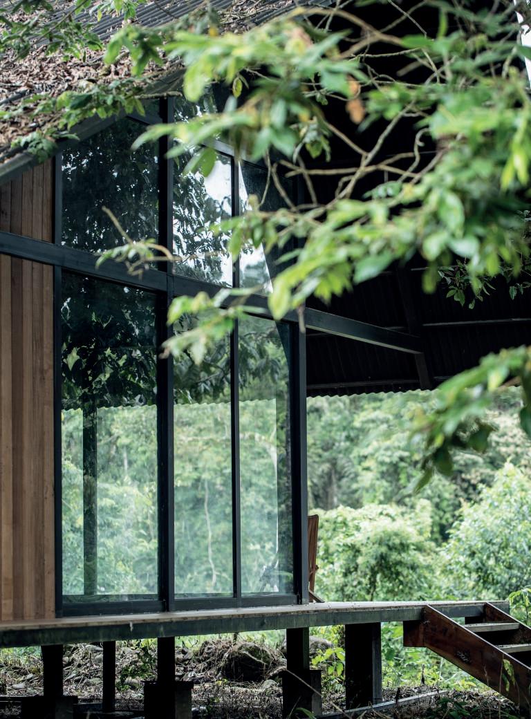 Asimismo, la elección del fierro como material estructural permite una terraza techada que se extiende hacia la exuberante vista del río y las montañas, sin obstrucciones visuales que interrumpan la conexión con la naturaleza.
