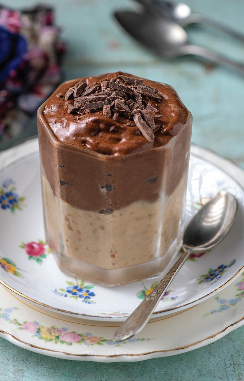 Crema chocolate: procesar los dátiles escurridos con un plátano, el café y el cacao hasta tener una crema homogénea, servir en vasos una primera capa de la crema blanca, la crema café por encima, terminar con chispas o chocolate picado, volver a congelar un rato si les gusta más firme o comer así.