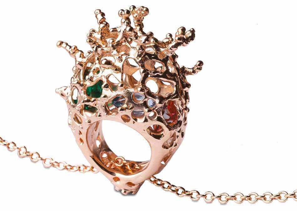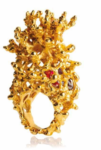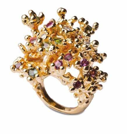 Por Marcela Cademartori – Ph: Ioris Premoli - Milán“Corina” anillo en bronce bañado en oro 18 quilatesengastado con rodolitas, moisanitas, turmalinas.