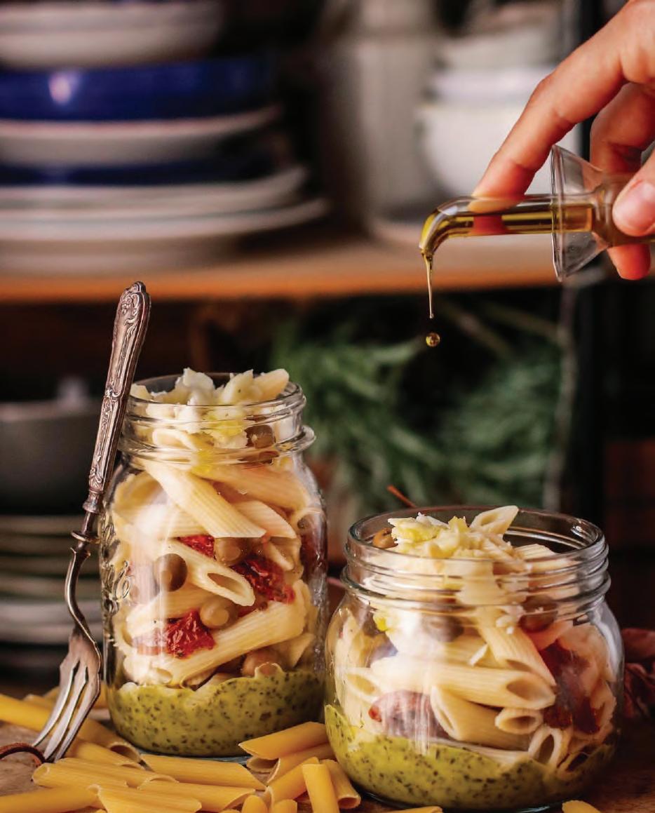 160 g. penne rigate 4 cucharadas de salsa Pesto parmesano en polvo aceitunas arbequina tomates deshidratados orégano seco