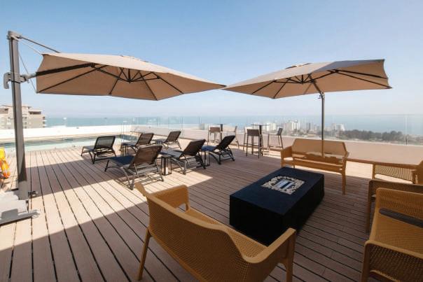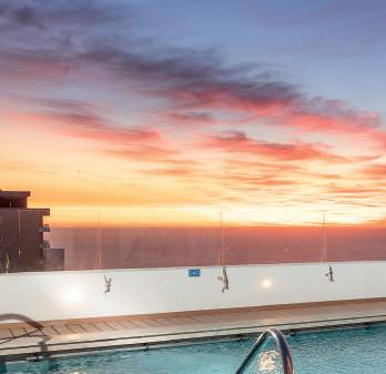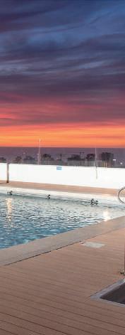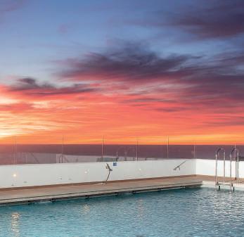 Qué te parece la idea de refrescarte en la piscina panorámica repleta de luz y maderas mientras observas el bello atardecer marino. Un verdadero panorama y una invitación para relajarse en la azotea del piso 20.