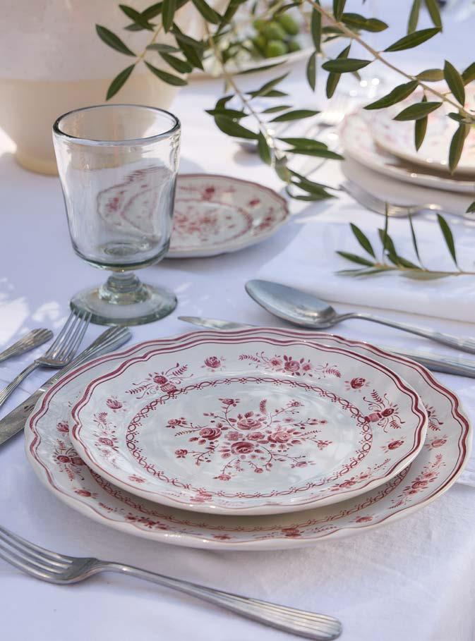 1. Vila dinner plate 27 in olive-blue. 2. Rosa dinner plate 25 in rosé pink. 3. Vila appetizer plate 17 in pink-red. 4. Nau cutlery 5 pieces in antique brown. 5. Vila soup/cereal bowl 16 in olive-blue. 6. Vila dinner plate 27 in pink-red. 7. Alentejo appetizer plate 14 in turquoise. 8. Rosa soup/cereal bowl 16 in rosé pink. 9. Alentejo candle holder 4 in white. 10. Alentejo square ramekin 10 in turquoise. 11. Maria napkin in mint and lily green. 12. Rosa serving bowl 30 in rosé pink. 13. Grespresso lungo cup 19 cl in soft pink. 14. Sensa tumbler 30 cl and coupe glass 21 cl in pink magnolia. 15. Livia pitcher 219 cl in white.